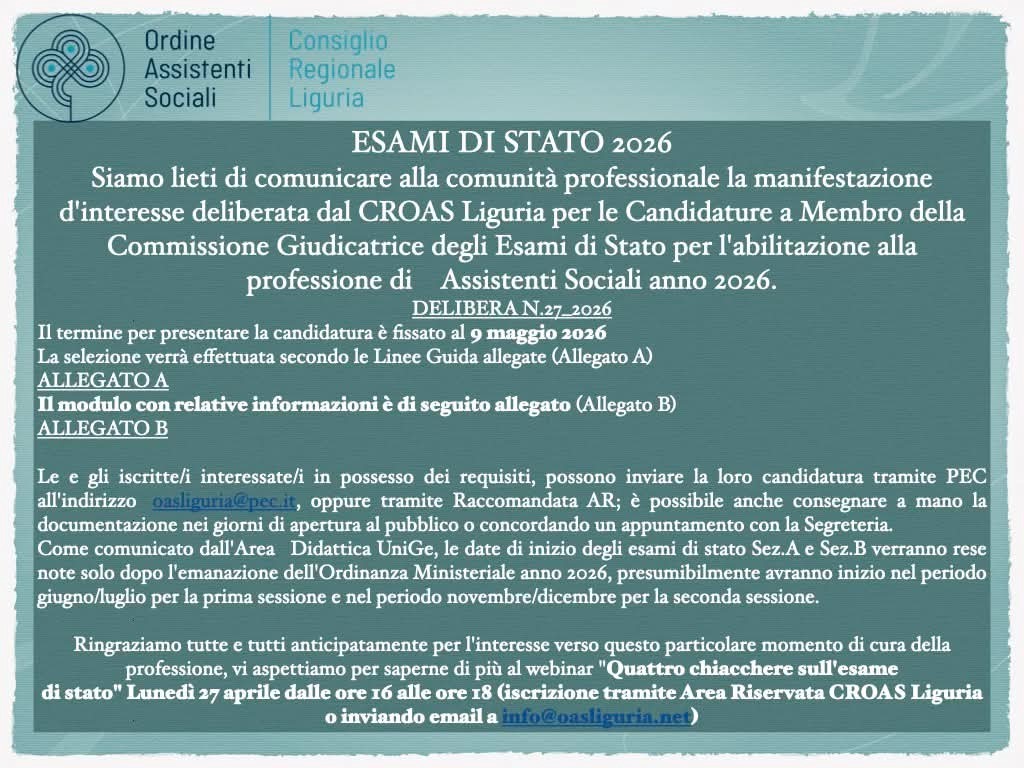 "Siamo lieti di comunicare alla comunità professionale la manifestazione d'interesse deliberata dal CROAS Liguria per le Candidature a Membro della Commissione Giudicatrice degli Esami di Stato per l'abilitazione alla professione di Assistenti Sociali anno 2026.