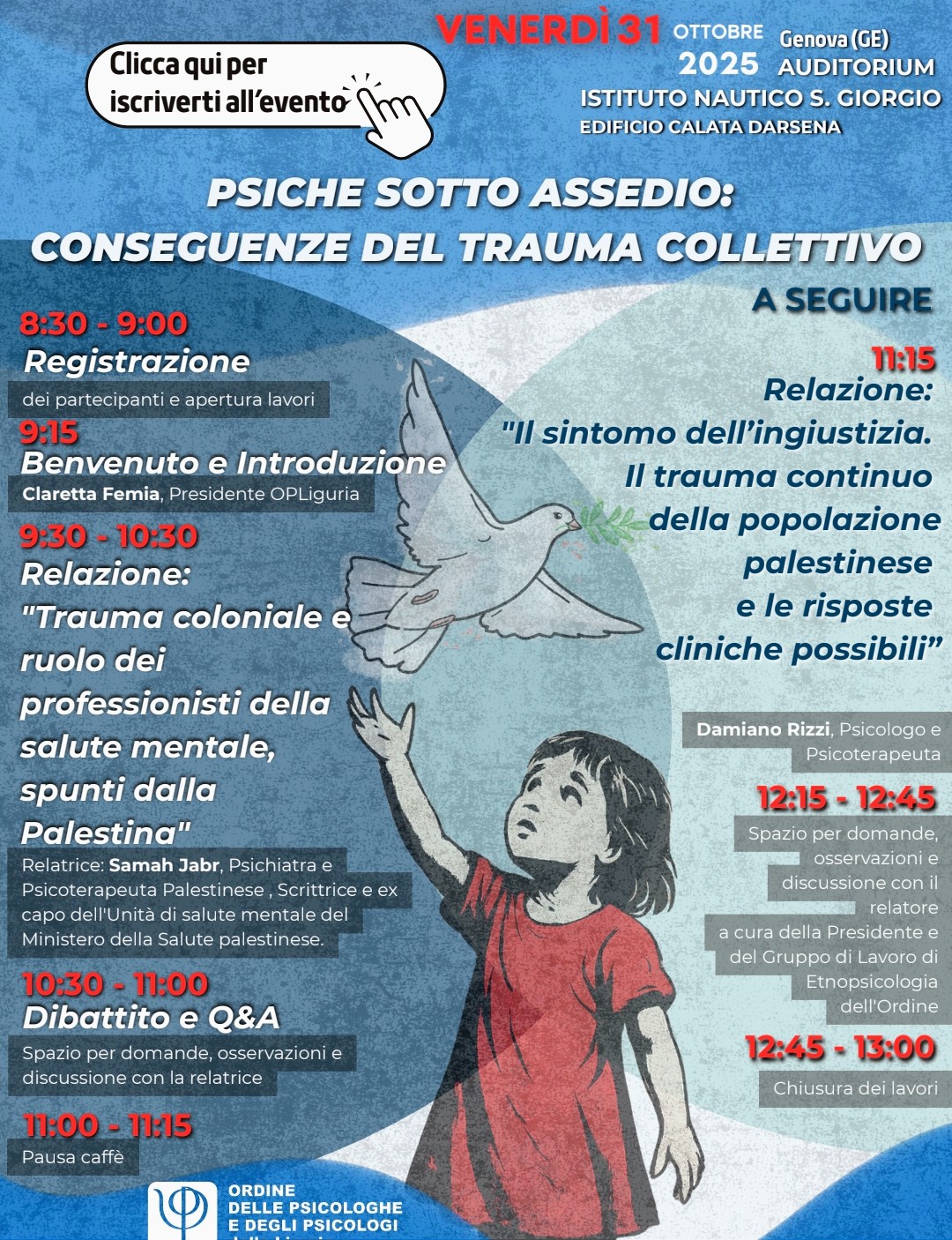 Il CROAS Liguria parteciperà alla giornata di studio con la dottoressa Samah Jabr, psichiatra e psicoterapeuta di Gaza, promossa dall'Ordine delle Psicologhe e degli Psicologi della Liguria, evidenziando l'importanza di affrontare tematiche psicologiche e sociali di grande rilevanza umanitaria.