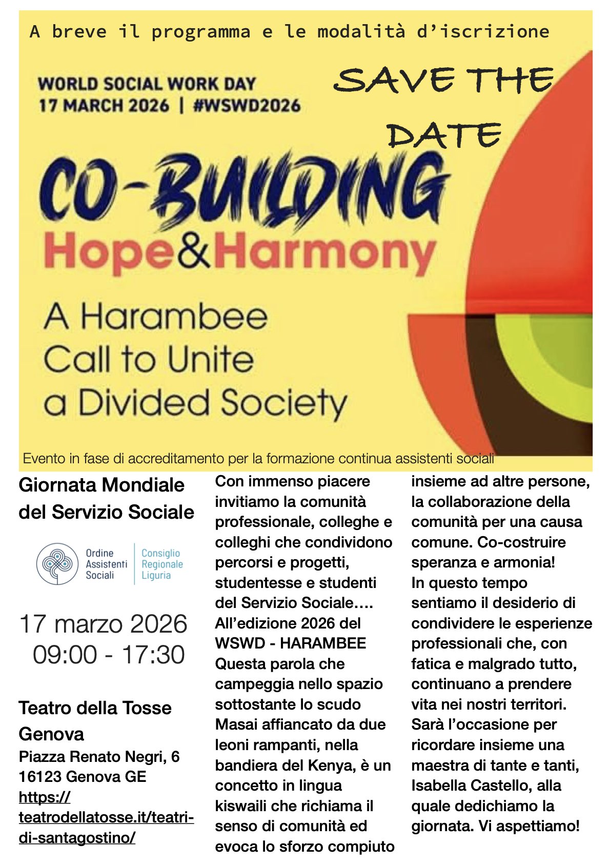 Evento accreditato per la formazione continua professionale da CROAS Liguria