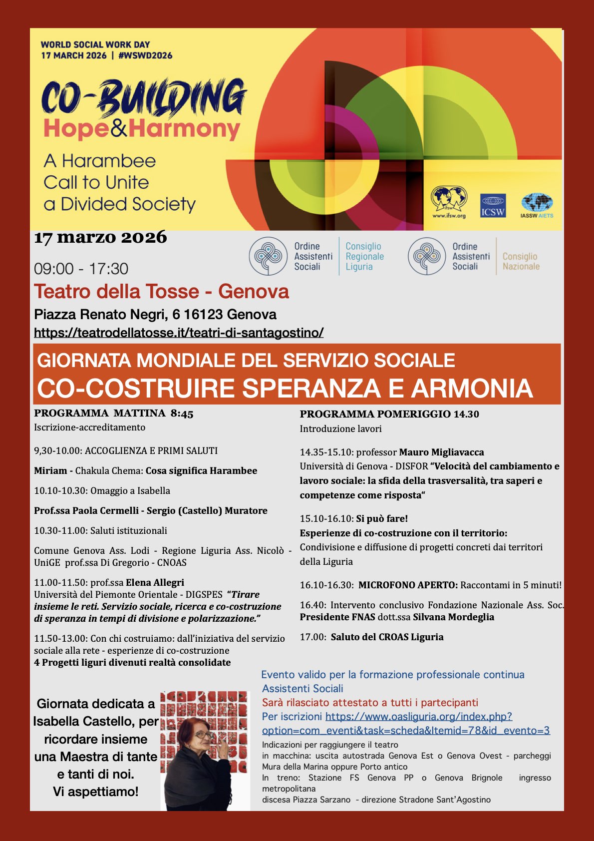 L’evento, patrocinato dall’Ordine degli Assistenti Sociali della Liguria, è in fase di accreditamento per la formazione continua degli Assistenti sociali