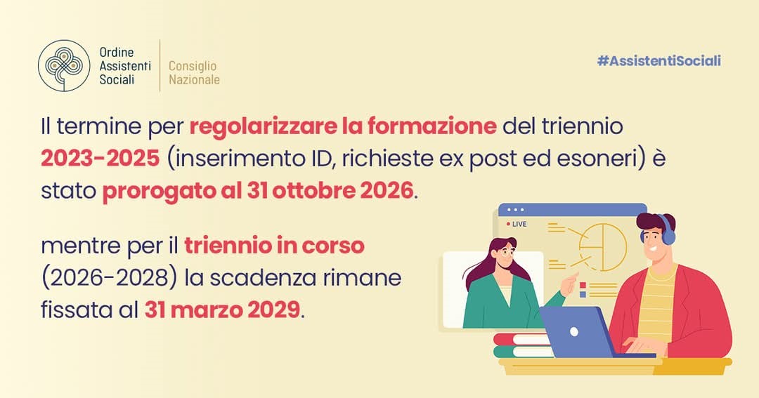 Il termine entro il quale il professionista assistente sociale deve inserire i dati relativi alle attività formative svolte o fruite fino al 31 dicembre 2025, a valere sul precedente triennio 2023-2025, diventa quindi il 31 maggio 2026.