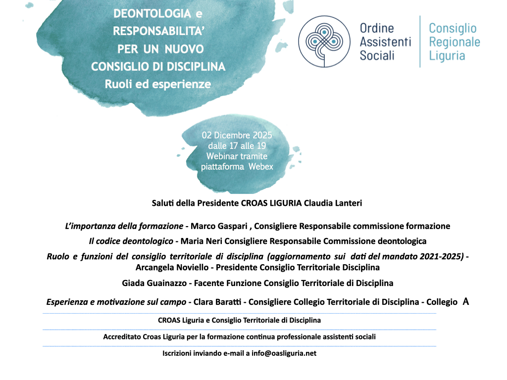 "Il CROAS Liguria in collaborazione con il Consiglio Territoriale di Disciplina, invita la comunità professionale degli Assistenti Sociali all'incontro dedicato al tema della cura degli aspetti deontologici e delle responsabilità professionali.